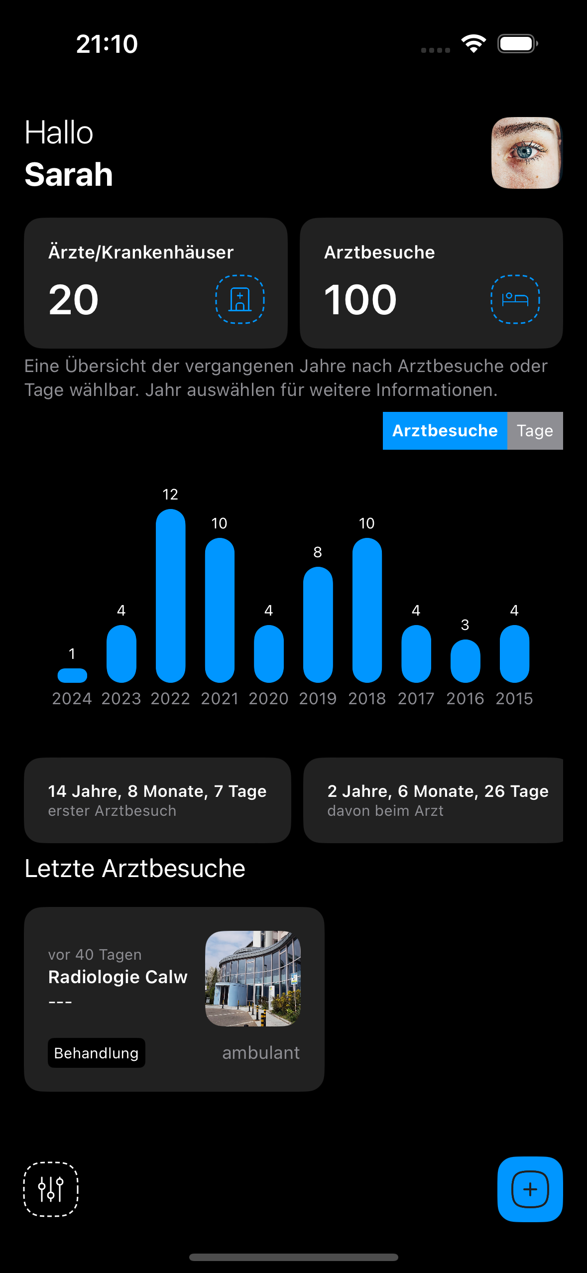 einen Blick, wie oft Du bei einem Arzt warst. Zu den einzelnen Aufenthalten kannst Du Bemerkungen und eine